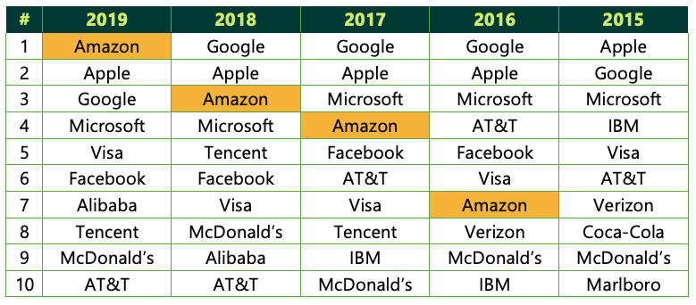 As you can see in the table below, Amazon have been on the upward move since 2015 when they occupied position 15 in the rankings. Amazon crept up to the top 10 the following year, taking 7th position, finishing in 3rd place in 2018. Not a surprise really with all the growth, acquisition, investment and innovation activity over the past few years.